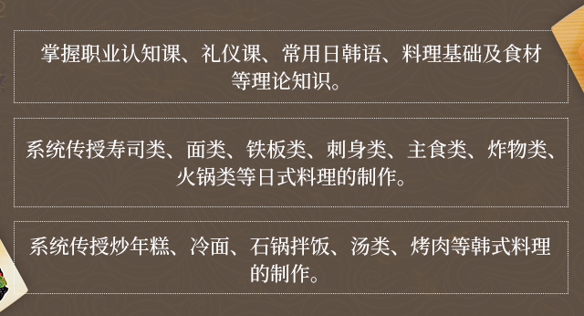 招生对象:对日韩料理有追求和浓厚兴趣的学员,均可报名。